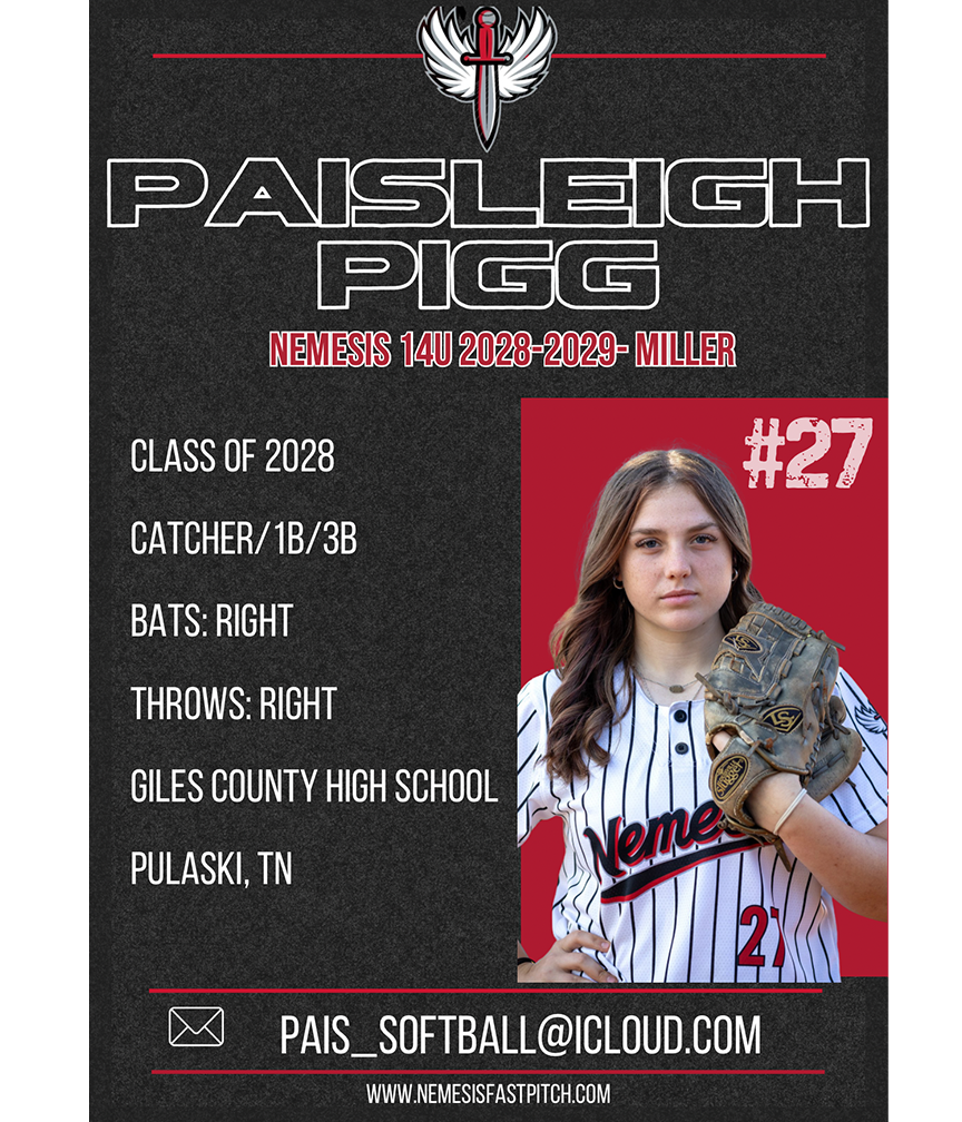 Paisleigh is an athlete in the class of 2028 at Giles County High School and has been playing travel softball since she was 7 years old. Paisleigh's natural talent and exceptional skills behind the plate have made her a standout catcher and a great defensive asset to her team. Her quick reflexes and strong arm have even the best base runners second guessing a steal.