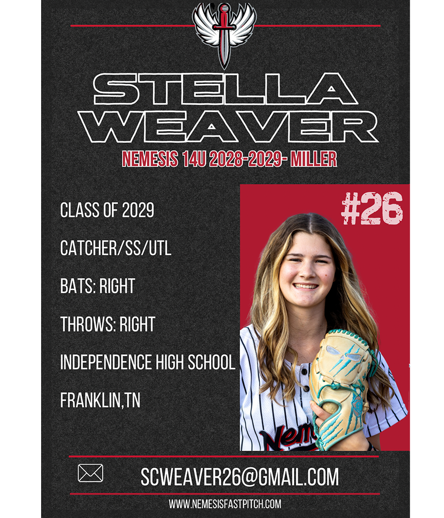 Stella Weaver plays SS and Catcher in her second season of softball. Along with her fielding, she brings a heavy bat to the lineup and speed on the bases. She is a 2029 graduate and will attend Independence HS next year where she hopes to continue her softball career. Stella comes to softball after 4 seasons of travel baseball. Stella is so excited to be back on a Nolensville team because this community has been so good to her.